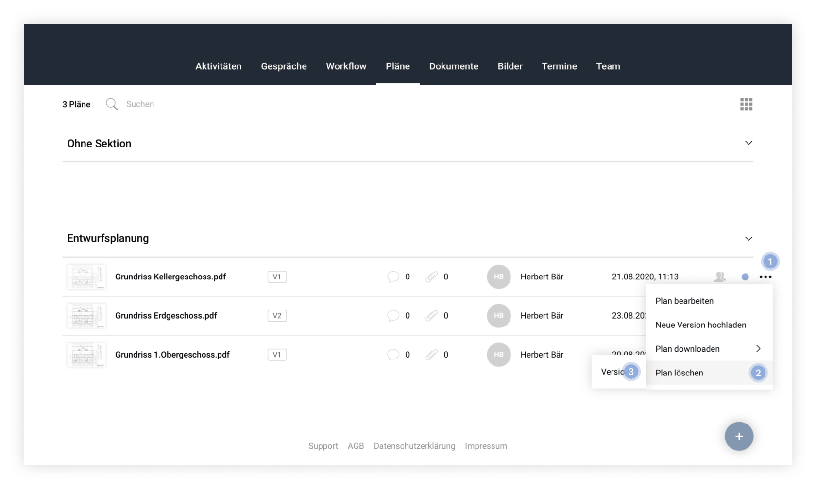 So können Sie als Verfasser oder Projektinhaber bzw. -administrator einen Plan löschen:
